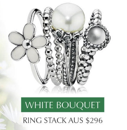 This ring stack consists of 4 sterling silver Pandora rings. 3 rings have opal and other stones as gemstones on sterling silver metal ring. These are floral themed and great to use in this summer. This stack is called White Bouquet and is specifically designed to use with white of light colored apparel. So, if you are going to wear white fancy clothes then you must go with these white bouquet Pandora rings. The retail price of these 4 rings is $296 (AUD).